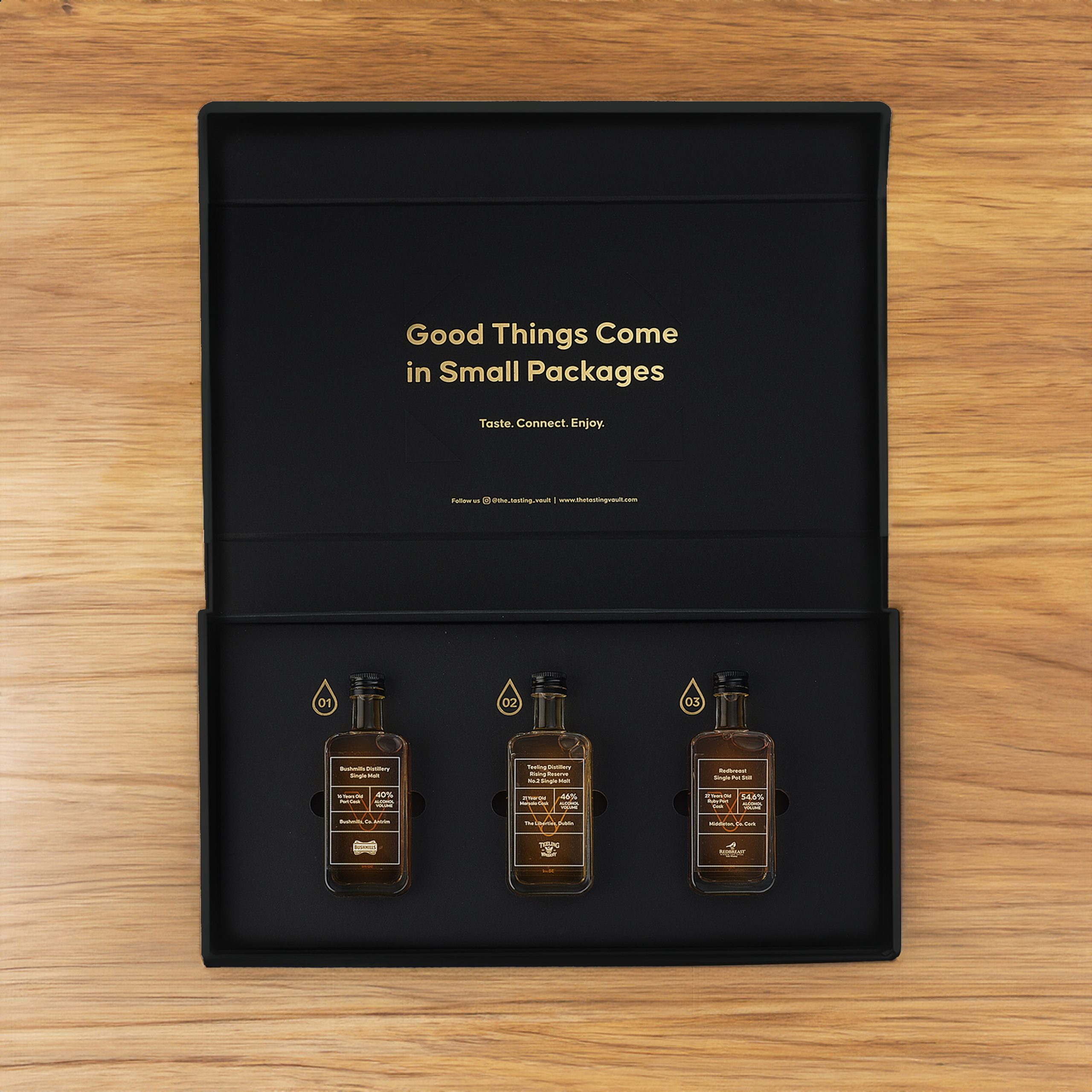 A key feature of the design is the brand’s “V” symbol, which represents the word “Vault” and subtley incorporates a whiskey droplet within the “V,” symbolizing the monthly delivery of curated whiskey selections – their monthly drop. The tagline, “Taste. Connect. Enjoy.” captures the essence of the brand, communicating its message in a sophisticated yet friendly tone. The vault-inspired design is enhanced with gold foil debossing, giving the packaging an air of exclusivity. The ample spacing around the bottles adds to the luxury feel, while tabs ensure the bottles are easily accessible. Inside the lid, the playful message “Good Things Come in Small Packages” adds a light-hearted element, complementing the overall elegance. Social media details are included to encourage consumer engagement and help grow the brand’s online community.