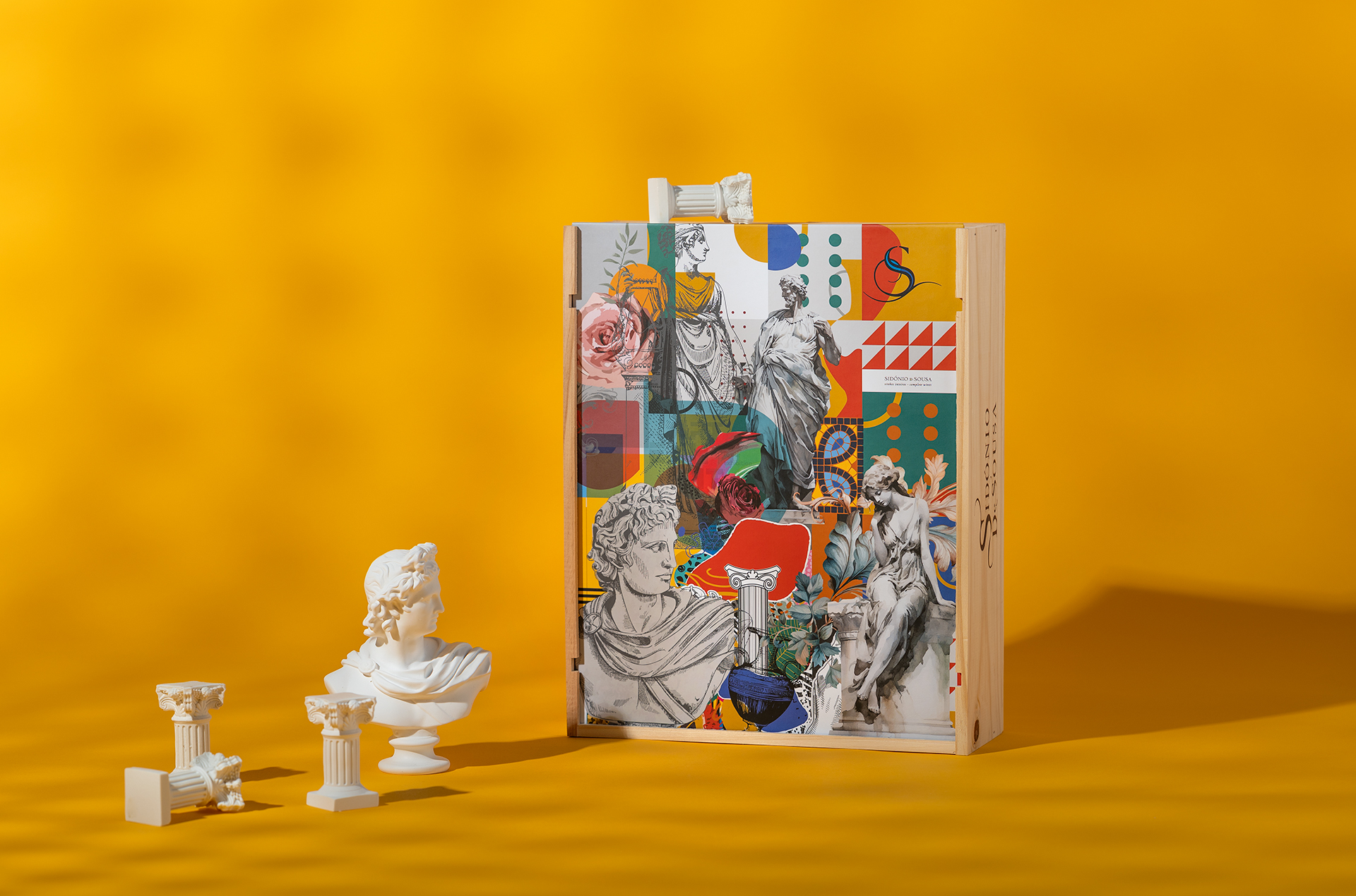 Far beyond traditional wine packaging, each cover is a collectible object. Classical sculptures melt into geometric abstraction; bold shapes dance with historical motifs; colors pulse with layered meaning. These boxes invite discovery, encouraging the viewer to explore the blend of influences that shaped them.